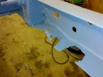 Hittat ett hål höger fram stort som en femkrona i pressningen mot dörhålet o likaså ett litet hål efter klantig lagning under förarstolen.